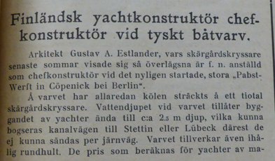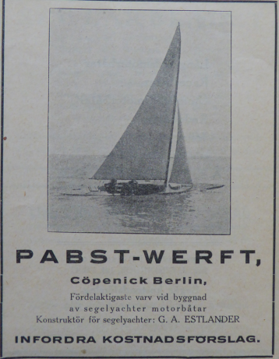 Gustaf Estlander lämnar Abeking & Rasmusen för det av Richard Borck nystartade varvet Pabst Werft i Köpenick i närheten av Berlin. Målsättningen är att leverera segelbåtar till den inhemska tyska marknaden men även till den nordiska marknaden.
