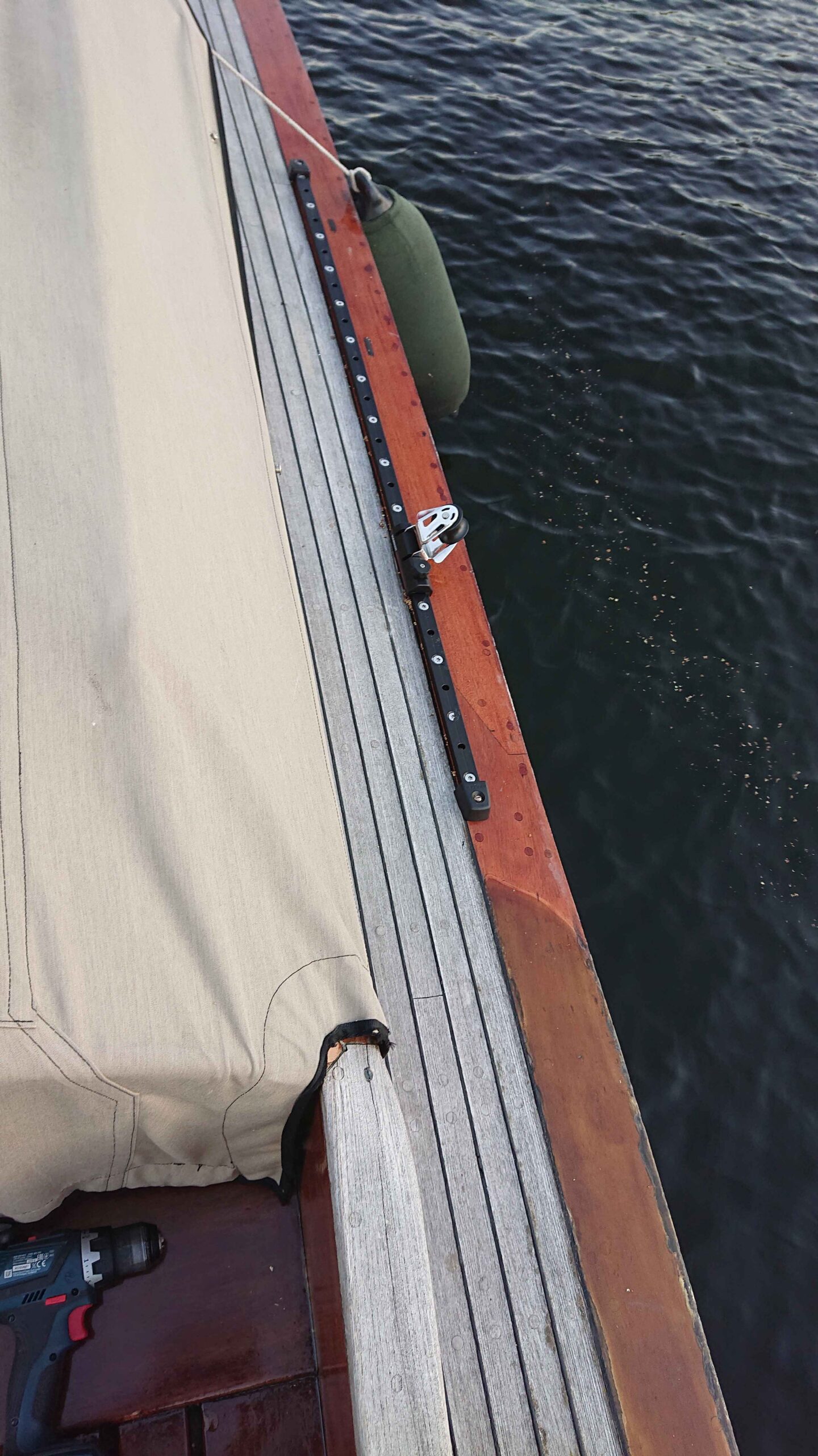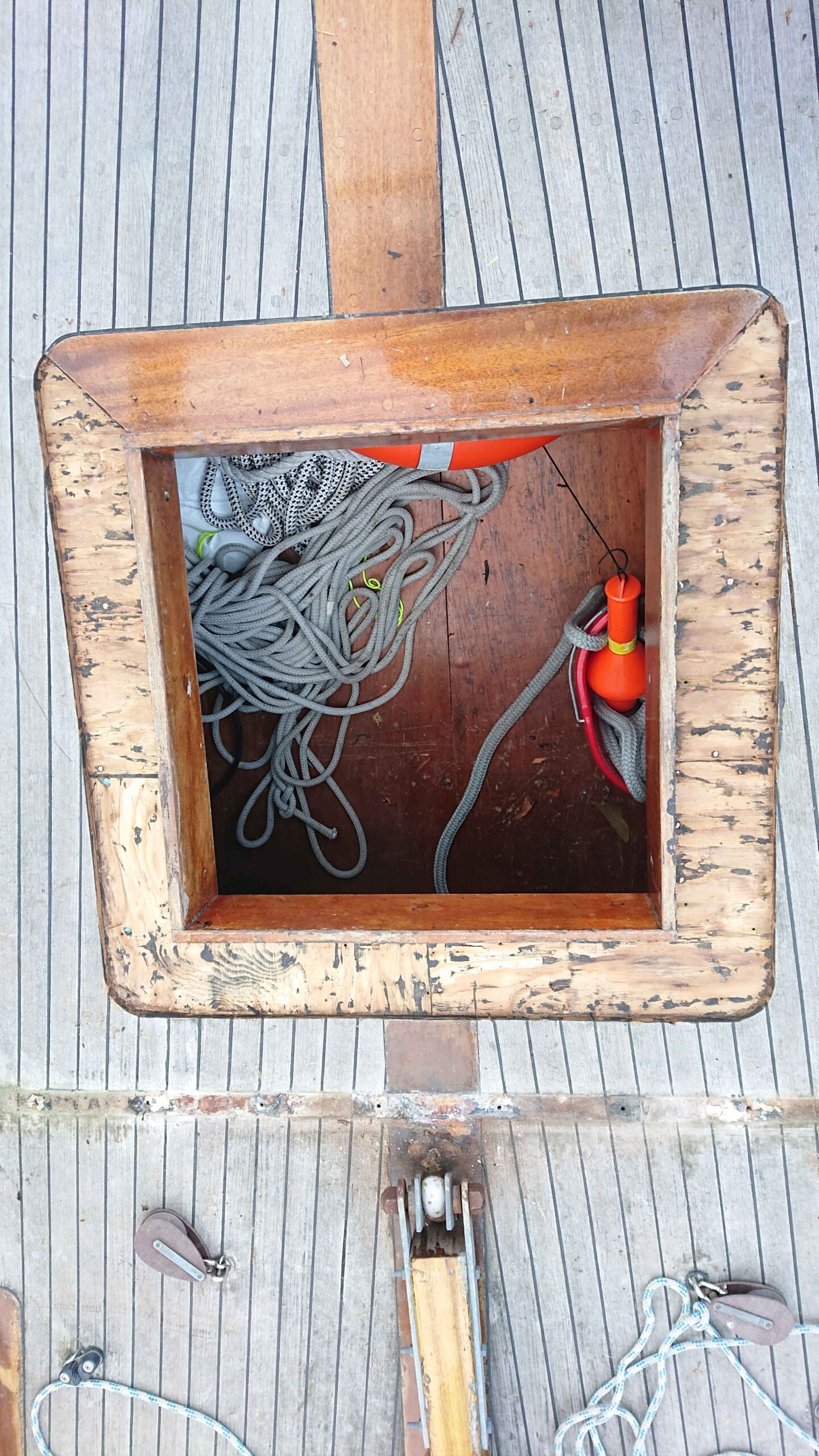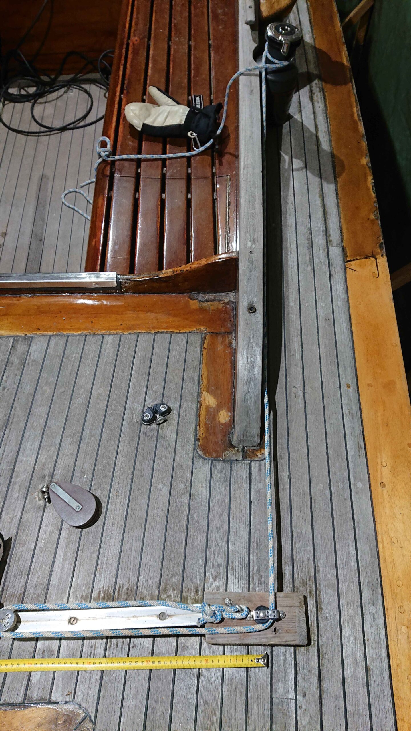 Vid den stora renoveringen av akterskepp med nytt däck 2019/20 beslutades att avgränsa arbetet vid akterlucka samt friser i däck. Vidare var däcket allra längst fram skadat efter 50 års segling och skavande förtöjningslinor. Vi beslutades oss också för att återgå till fotlister liknande originalet, dvs infästa innanför skarndäck. Dessa gjordes med öppningar för att dels utgöra spygatter och dels erbjuda ett grabbräcke på däck.