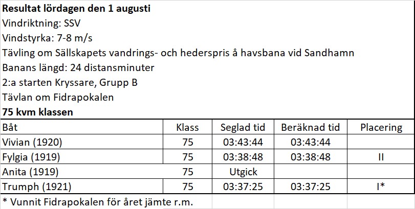Mycket intressant blevo seglingarna om KSSS stora samling vackra och dyrbara vandringspris. Intresset för 75-ornas kamp om den s.k. Fidrapokalen var också stort. Trumph, den finska representanten, hade på fredagen gått om Fylgia, men nu såg det ut som om segern skulle gå till Sverige. Trumph fick storfallet i olag omedelbart innan starten och fick skadan reparerad först i siste minuten. På triangelns första ben löpte Fylgia lätt fram i ledningen med Vivian som andra båt. Sist låg Anita. Emellertid hade kryssen varat helt kort, innan Trumph tagit ledningen, och sedan lät magister Cannelin (rorsman) sig icke omseglas. Fylgia slörade väl in en del av avståndet hon förlorat på kryssen, men det räckte ej till för en svensk seger.