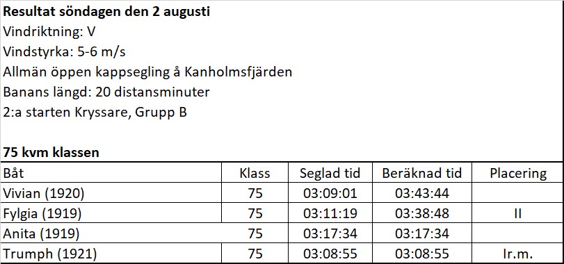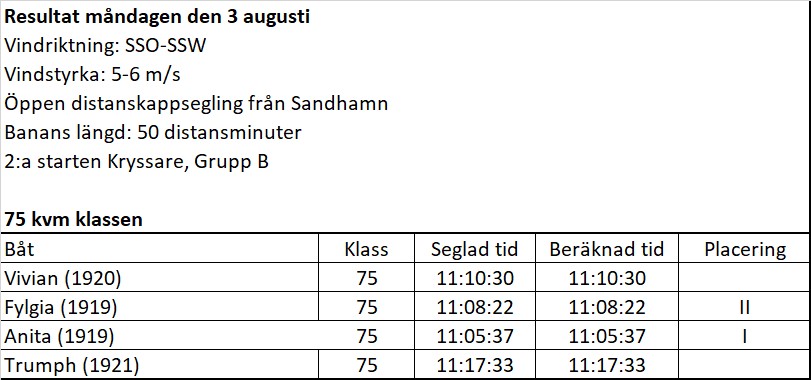Banan befanns vara lagd med start från Skanskobben med mål i Österskär. På grund av svaga vindar kortades banan med mål i Bammarboda vid Uvön. Av 75-orna gick Västerviksbåten Anita in på bästa tid med 11.05.37 och belade därigenom första pris i sin klass, en välförtjänt seger efter de ansträngningar båten gjort under hela regattan. Andra pris togs av Fylgia med en tid av 11.08.22, och tredje plats belades av Vivian med 1.10.30.